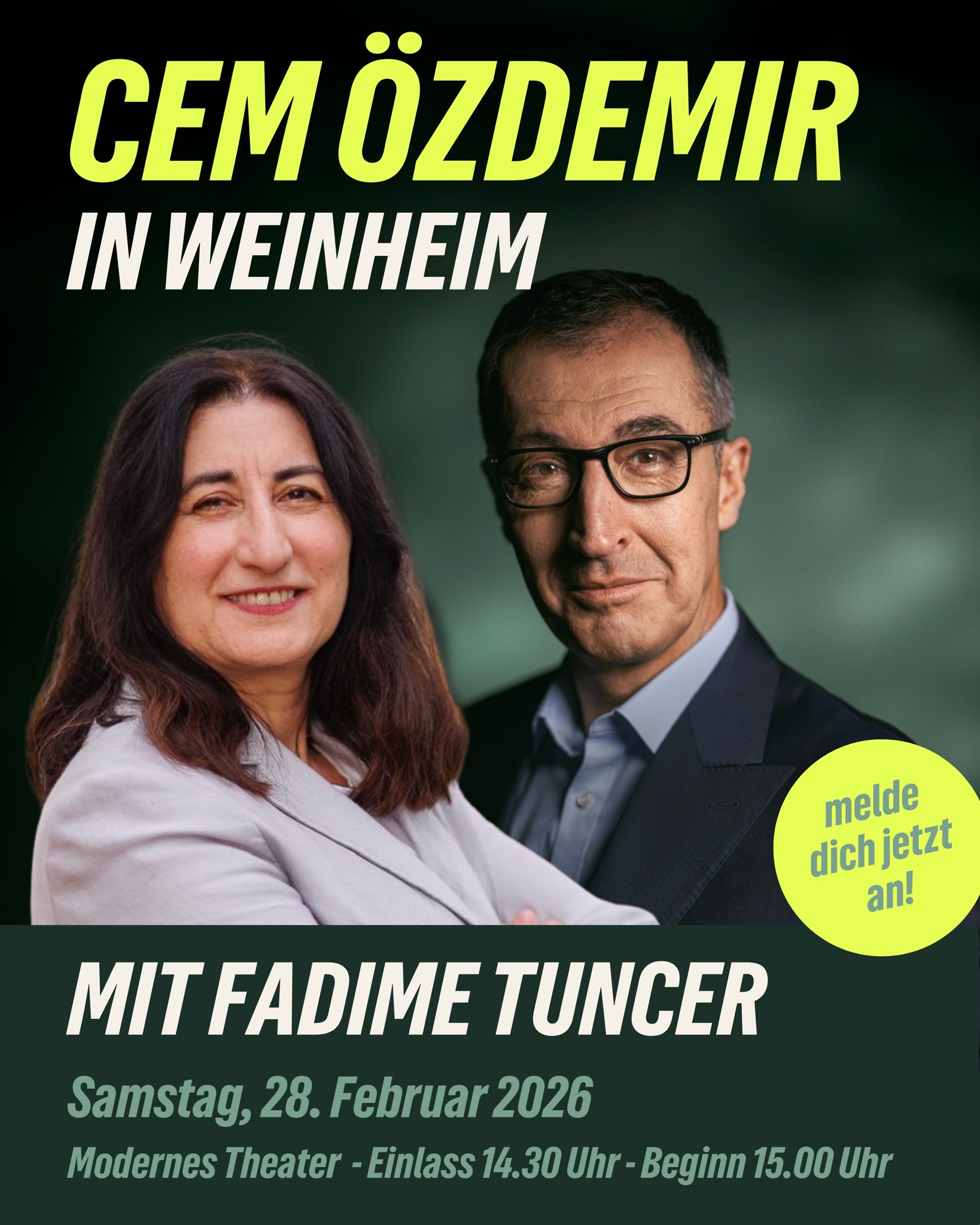 Cem Özdemir in Weinheim Samstag den 28.2.2026 Weinheim, Modernes Theater Hauptstraße 61 Samstag28.02.202615:00 – 17:00 UhrModernen TheaterHauptstraße 61WeinheimDownload als ics-Datei